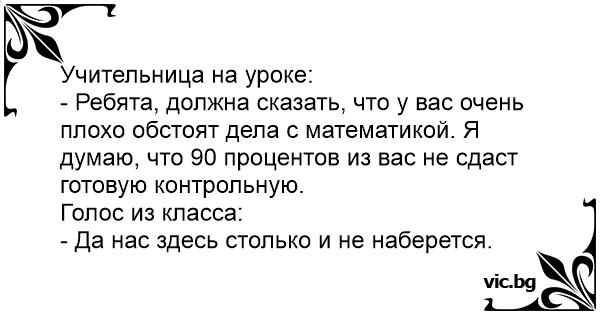 - Ребята, должна сказать, что у вас очень плохо обстоят дела с математикой. Я думаю, что 90 процентов из вас не сдаст готовую контрольную.