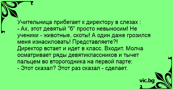 Директор встает и идет в класс. Входит. Молча осматривает ряды девятиклассников и тычет пальцем во второгодника на первой парте: