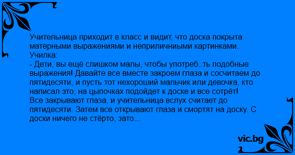 - Дети, вы ещё слишком малы, чтобы употреб..ть подобные выражения! Давайте все вместе закроем глаза и сосчитаем до пятидесяти, и пусть тот нехороший мальчик или девочка, кто написал это, на цыпочках подойдет к доске и все сотрёт!