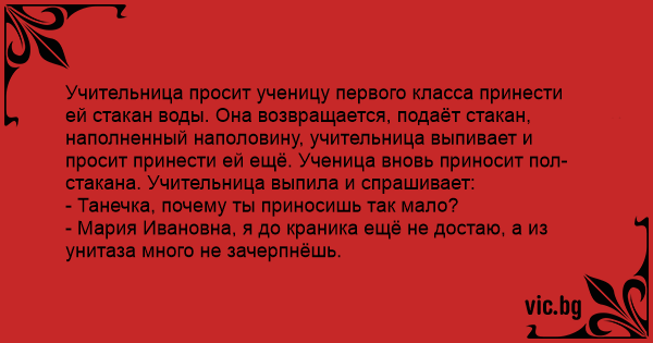Учительница просит ученицу первого класса принести ей стакан воды. Она возвращается, подаёт стакан, наполненный наполовину, учительница выпивает и просит принести ей ещё. Ученица вновь приносит пол-стакана. Учительница выпила и спрашивает:
