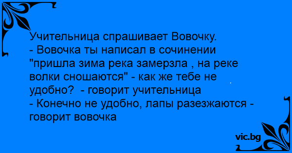 - Вовочка ты написал в сочинении "пришла зима река замерзла , на реке волки сношаются" - как же тебе не удобно? - говорит учительница