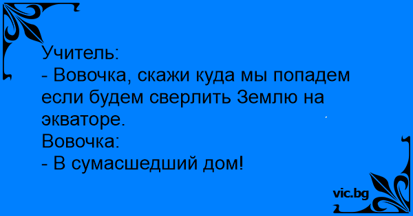 - Вовочка, скажи куда мы попадем если будем свеpлить Землю на экватоpе.