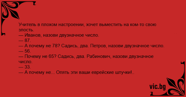 — Почему не 65? Садись, два. Рабинович, назови двузначное число.