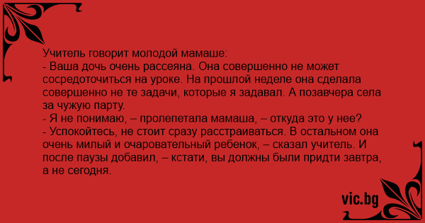 - Ваша дочь очень рассеяна. Она совершенно не может сосредоточиться на уроке. На прошлой неделе она сделала совершенно не те задачи, которые я задавал. А позавчера села за чужую парту.