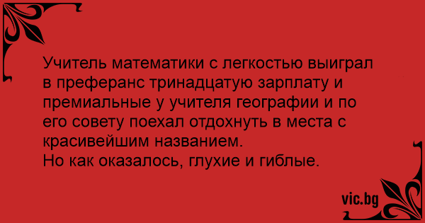Учитель математики с легкостью выиграл в преферанс тринадцатую зарплату и премиальные у учителя географии и по его совету поехал отдохнуть в места с красивейшим названием.