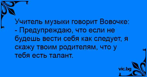 Учитель музики говорить Вовочці: — Попереджаю, що якщо не будеш поводитися як слід, я скажу твоїм батькам, що в тебе є талант!