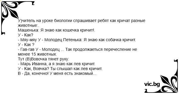 У)читель на уpоке биологии спpашивает pебят как кpичат pазные животные:.