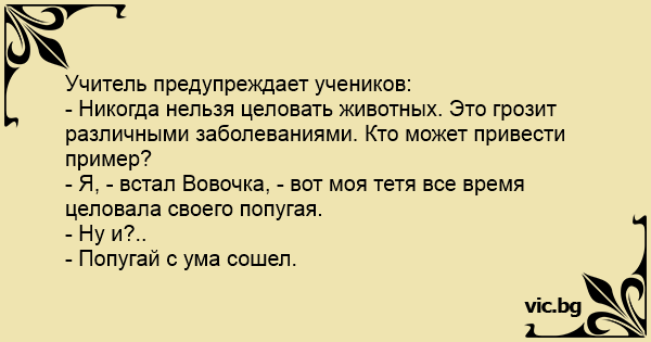 - Я, - встал Вовочка, - вот моя тетя все время целовала своего попугая.