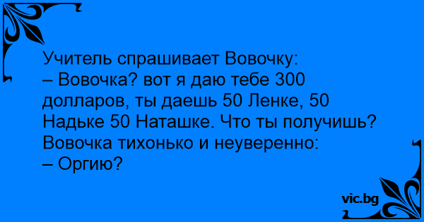 – Вовочка? вот я даю тебе 300 долларов, ты даешь 50 Ленке, 50 Надьке 50 Наташке. Что ты получишь?