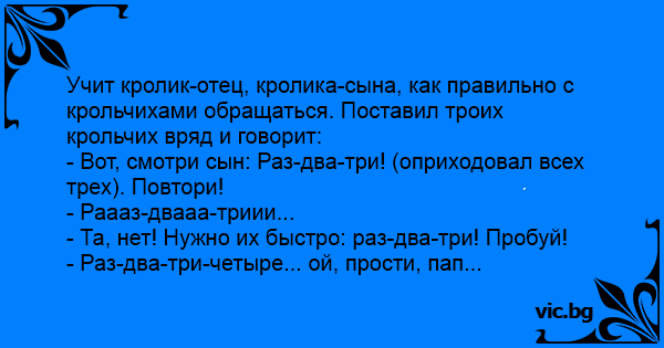 Учит кролик-отец, кролика-сына, как правильно с крольчихами обращаться. Поставил троих крольчих вряд и говорит: