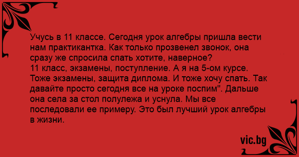 11 класс, экзамены, поступление. А я на 5-ом курсе. Тоже экзамены, защита диплома. И тоже хочу спать. Так давайте просто сегодня все на уроке поспим". Дальше она села за стол полулежа и уснула. Мы все последовали ее примеру. Это был лучший урок алгебры в жизни.