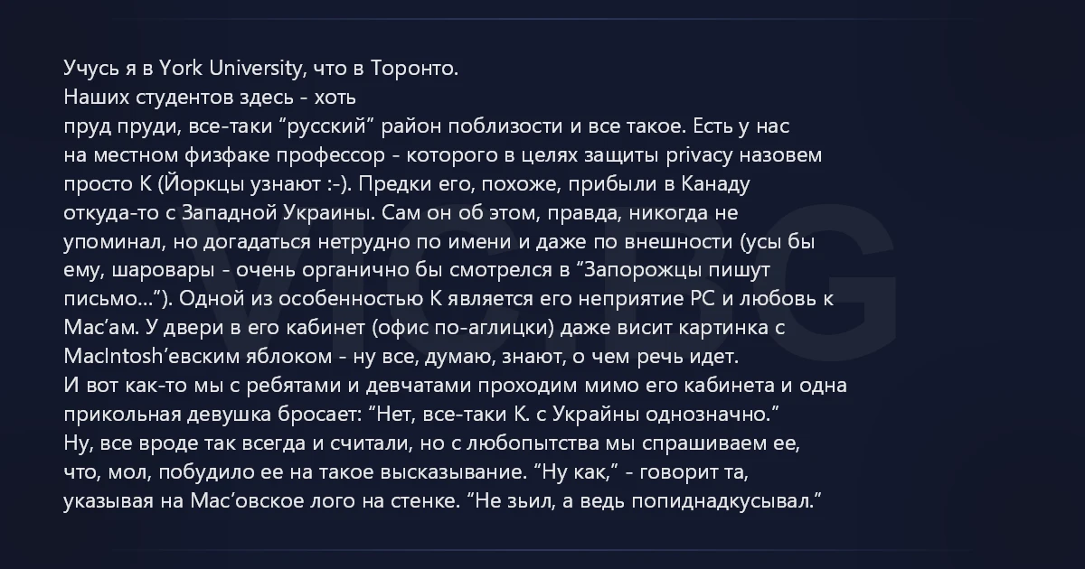 Учусь я в York University, что в Торонто. Наших студентов здесь - хоть пруд пруди, все-таки “русский” район поблизости и все такое. Есть у нас на местном физфаке профессор - которого в целях защиты privacy назовем просто К (Йоркцы узнают :-). Предки его, похоже, прибыли в Канаду откуда-то с Западной Украины. Сам он об этом, правда, никогда не упоминал, но догадаться нетрудно по имени и даже по внешности (усы бы ему, шаровары - очень органично бы смотрелся в “Запорожцы пишут письмо…”). Одной из особенностью К является его неприятие PC и любовь к Mac’ам. У двери в его кабинет (офис по-аглицки) даже висит картинка с MacIntosh’евским яблоком - ну все, думаю, знают, о чем речь идет. И вот как-то мы с ребятами и девчатами проходим мимо его кабинета и одна прикольная девушка бросает: “Нет, все-таки К. с Украйны однозначно.” Ну, все вроде так всегда и считали, но с любопытства мы спрашиваем ее, что, мол, побудило ее на такое высказывание. “Ну как,” - говорит та, указывая на Mac’овское лого на стенке. “Не зьил, а ведь попиднадкусывал.”