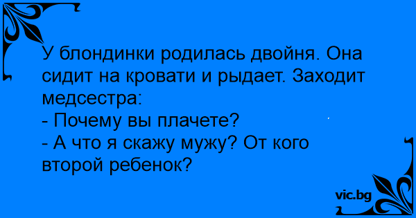 Blondine und Zwillinge Въпрос: Една блондинка родила близнаци и започнала да плаче в болницата. C'est une blonde qui a accouché de 2 beaux bébés, des jumeaux, cependant, elle pleure à n'en plus finir ! Въпрос: - Какво си мисли блондинка, която е родила близнаци? Блондинка току що е родила близнаци. Седи на леглото и плаче. Идва сестрата: Que fait le mari d'une blonde qui vient d'accoucher de jumeaux ? Blondinen var blitt nybakt tvillingmor og gråt sine modige tårer på barselklinikken dagen etter fødselen. Sykepleieren trodde hun led av fødselsdepresjon og tilkalte sykehusets psykolog.... En blondine tager en tur til lægen og finder ud af hun er gravid med tvillinger. Hun begynder at græde og så spørg lægen ”Hvorfor græder du? ” Hvor efter hun svare ”Jeg ved, hvem der er far til den... Una rubia llora en la maternidad de un hospital. La enfermera le pregunta: - ¿Por qué lloras? - He tenido gemelos - responde sollozando la rubia. - ¿Y qué? - ¿Qué le diré a mi marido? ¿De dónde he... Блондинка у пологовому будинку плаче. Медсестра запитує: — Чому ви плачите? — У мене двійня! — І що? — Що я чоловікові скажу? Звідки друга дитина? Eine Blondine hat gerade Zwillinge zur Welt gebracht und weint ununterbrochen. Die Schwester fragt sie nach dem Grund. "Ich weiß nicht, von wem das Zweite ist", antwortet die Blondine. A blond gave birth to two twins and continously crying. A nurse asks her what's the problem. She replies,"I don't know with whom I have the second baby..." Blondīnei piedzimst dvīņi. Viņa sēž un rūgti raud. Pienāk medmāsa un prasa: Kādēļ Jūs raudat? Ko es teikšu vīram, no kā man ir otrs bērns?