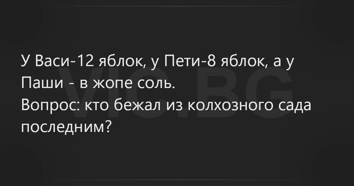 У Васи-12 яблок, у Пети-8 яблок, а у Паши - в жопе соль.