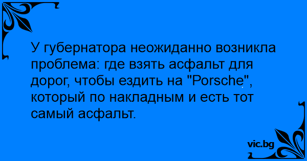 У губернатора неожиданно возникла проблема: где взять асфальт для дорог, чтобы ездить на "Роrsсhе", который по накладным и есть тот самый асфальт.