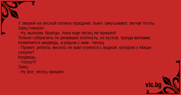 Только собрались по рюмашке хлопнуть, из кустов, треща ветками, появляется медведь, а рядом с ним - песец.