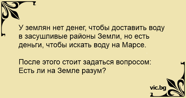 У землян нет денег, чтобы доставить воду в засушливые районы Земли, но есть деньги, чтобы искать воду на Марсе.