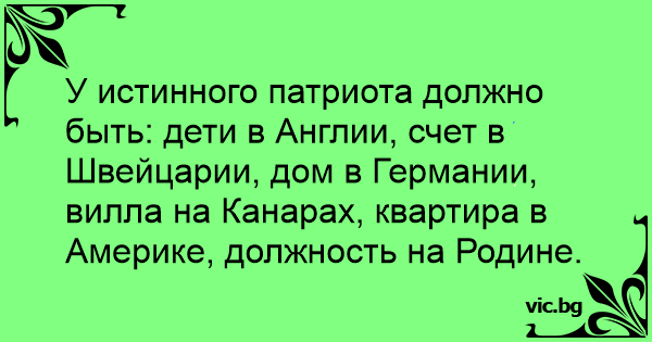 У истинного патриота должно быть: дети в Англии, счет в Швейцарии, дом в Германии, вилла на Канарах, квартира в Америке, должность на Родине.