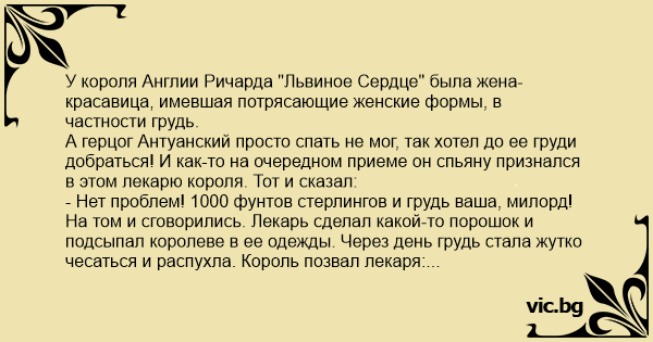 А герцог Антуанский просто спать не мог, так хотел до ее груди добраться! И как-то на очередном приеме он спьяну признался в этом лекарю короля. Тот и сказал: