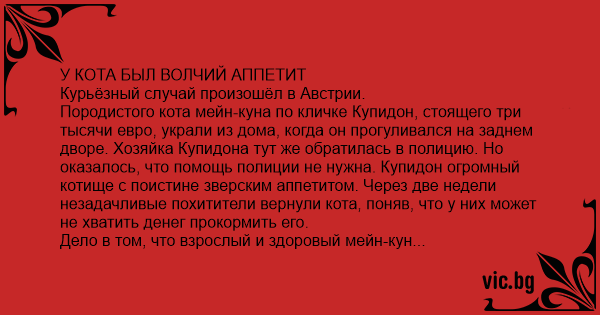Курьёзный случай произошёл в Австрии. Породистого кота мейн-куна по кличке Купидон, стоящего три тысячи евро, украли из дома, когда он прогуливался на заднем дворе. Хозяйка Купидона тут же обратилась в полицию. Но оказалось, что помощь полиции не нужна. Купидон огромный котище с поистине зверским аппетитом. Через две недели незадачливые похитители вернули кота, поняв, что у них может не хватить денег прокормить его. Дело в том, что взрослый и здоровый мейн-кун съедает в 3-4 раза больше, чем обычный домашний кот. При этом он не любит сухой корм, а предпочитает натуральные продукты. Длина тела взрослого кота этой породы превышает один метр, а вес превышает 10 килограммов. А вернули Купидона весьма оригинальным способом. - Я пошла выбрасывать мусор, - рассказывает хозяйка, - а когда вернулась, то Купидон уже сидел на диване в гостиной.