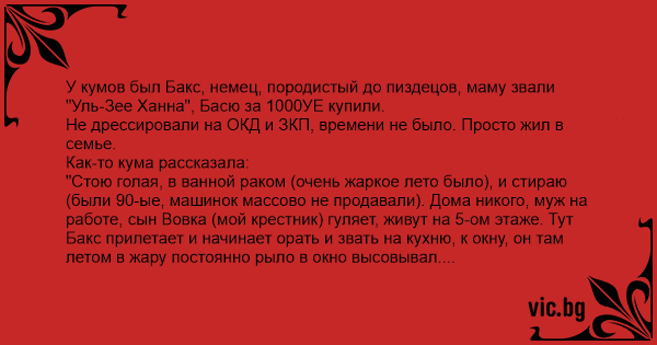 "Стою голая, в ванной раком (очень жаркое лето было), и стираю (были 90-ые, машинок массово не продавали). Дома никого, муж на работе, сын Вовка (мой крестник) гуляет, живут на 5-ом этаже. Тут Бакс прилетает и начинает орать и звать на кухню, к окну, он там летом в жару постоянно рыло в окно высовывал. Маша раз 15 его нах послала, мол, "Не мешай, cуka немецкая!!!", а он чуть за ноги не хватает, и на кухню к окну ведет!