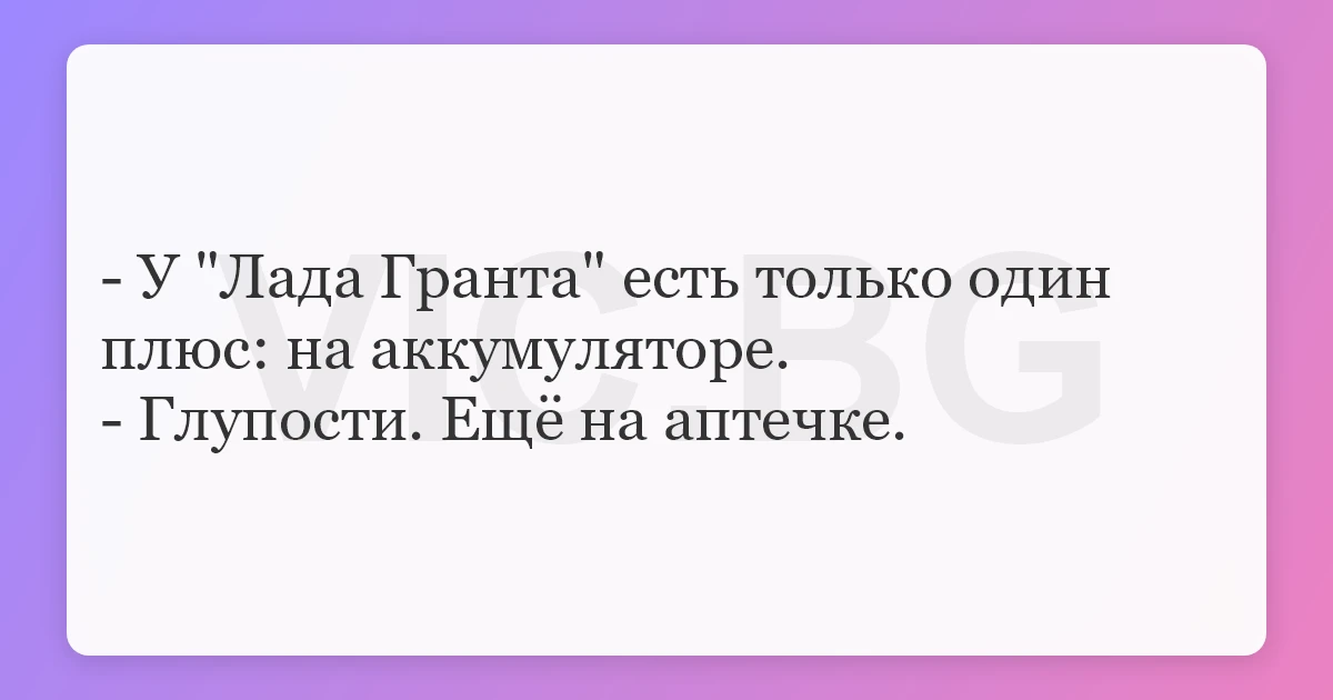 - У "Лада Гранта" есть только один плюс: на аккумуляторе. - Глупости. Ещё на аптечке.