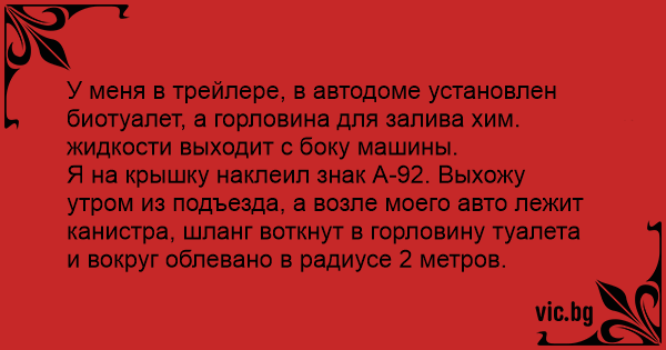 Я на крышку наклеил знак А-92. Выхожу утром из подъезда, а возле моего авто лежит канистра, шланг воткнут в горловину туалета и вокруг облевано в радиусе 2 метров.