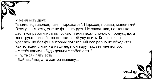 "владелец заводов, газет, пароходов". Пароход, правда, маленький. Газету, по-моему, уже не финансирует. Но завод жив, несколько десятков работников выпускают технически сложную продукцию, а конструкторское бюро старается её улучшить. Короче, жизнь удалась, но без финансовых потрясений всё равно не обходится. Как-то едем с ним на машине, и он вдруг задает мне вопрос: