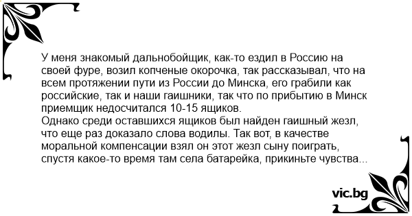 У меня знакомый дальнобойщик, как-то ездил в Россию на своей фуре, возил копченые окорочка, так рассказывал, что на всем протяжении пути из России до Минска, его грабили как российские, так и наши гаишники, так что по прибытию в Минск приемщик недосчитался 10-15 ящиков. Однако среди оставшихся ящиков был найден гаишный жезл, что еще раз доказало слова водилы. Так вот, в качестве моральной компенсации взял он этот жезл сыну поиграть, спустя какое-то время там села батарейка, прикиньте чувства водилы, когда разобрав жезл для замены батареек он нашел в нем более 800 $ в разной мелкой валюте. Такая вот моральная компенсация получилась.