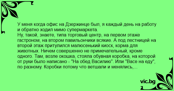 Ну, такой, знаете, типа торговый центр, на первом этаже гастроном, на втором павильончики всякие. А под лестницей на второй этаж притулился малюсенький киоск, корма для животных. Ничем совершенно не примечательный, кроме одного. Там, возле окошка, стояла обувная коробка, на которой от руки было написано - "На обед Василию". Или "Васе на еду", по разному. Коробки потому что ветшали и менялись, менялась и надпись. Не менялся только сам хозяин коробки. Который сидел тут же, внизу.