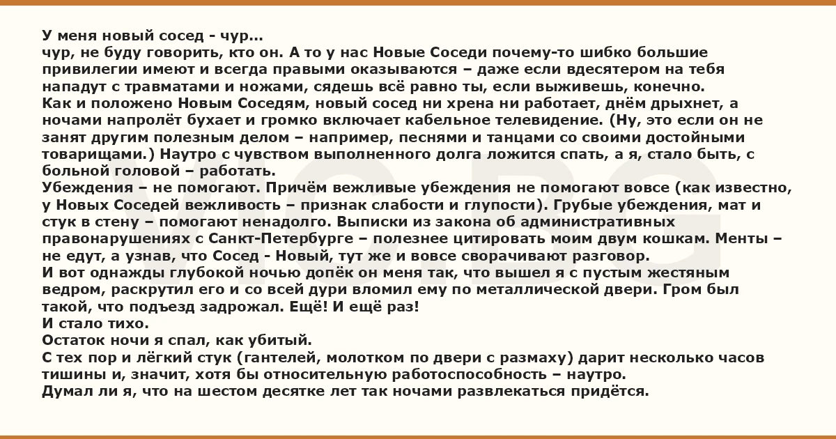 Как и положено Новым Соседям, новый сосед ни хpeнa ни работает, днём дрыхнет, а ночами напролёт бухает и громко включает кабельное телевидение. (Ну, это если он не занят другим полезным делом – например, песнями и танцами со своими достойными товарищами.) Наутро с чувством выполненного долга ложится спать, а я, стало быть, с больной головой – работать.
