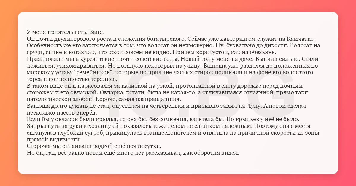 У меня приятель есть, Ваня. Он почти двухметрового роста и сложения богатырского. Сейчас уже кавторангом служит на Камчатке. Особенность же его заключается в том, что волосат он неимоверно. Ну, буквально до дикости. Волосат на груди, спине и ногах так, что кожи совсем не видно. Причём ворс густой, как на обезьяне. Праздновали мы в курсантские, почти советские годы, Новый год у меня на даче. Выпили сильно. Стали ложиться, утихомириваться. Но потянуло некоторых на улицу. Ванюша уже разделся до положенных по морскому уставу "семейников", которые по причине частых стирок полиняли и на фоне его волосатого торса и ног полностью терялись. В таком виде он и нарисовался за калиткой на узкой, протоптанной в снегу дорожке перед ночным сторожем и его овчаркой. Овчарка, кстати, была не какая-то, а отличавшаяся отчаянной, прямо таки патологической злобой. Короче, самая взаправдашняя. Ванюша долго думать не стал, опустился на четвереньки и призывно завыл на Луну. А потом сделал несколько пассов вперёд. Если бы у овчарки были крылья, то она бы, без сомнения, взлетела бы. Но крыльев у неё не было. Запрыгнуть на руки к хозяину ей показалось тоже делом не слишком надёжным. Поэтому она с места сиганула в глубокий сугроб, прикинулась траншеекопателем и отвалила на приличной скорости из зоны прямой видимости. Сторожа мы отпаивали водкой ещё почти сутки. Но он, гад, всё равно потом ещё много лет рассказывал, как оборотня видел.