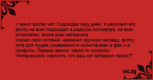 У меня пропал кот. Подождав пару дней, я расклеил его фотку на всех подъездах в радиусе километра, на всех остановках, возле всех магазинов. Указал свой сотовый, назначил крупную награду, фотку кота для пущей узнаваемости смонтировал в фас и в профиль. Первый звонок, какой-то мужичок: "Интересуюсь спросить, что ваш кот натворил такого?"