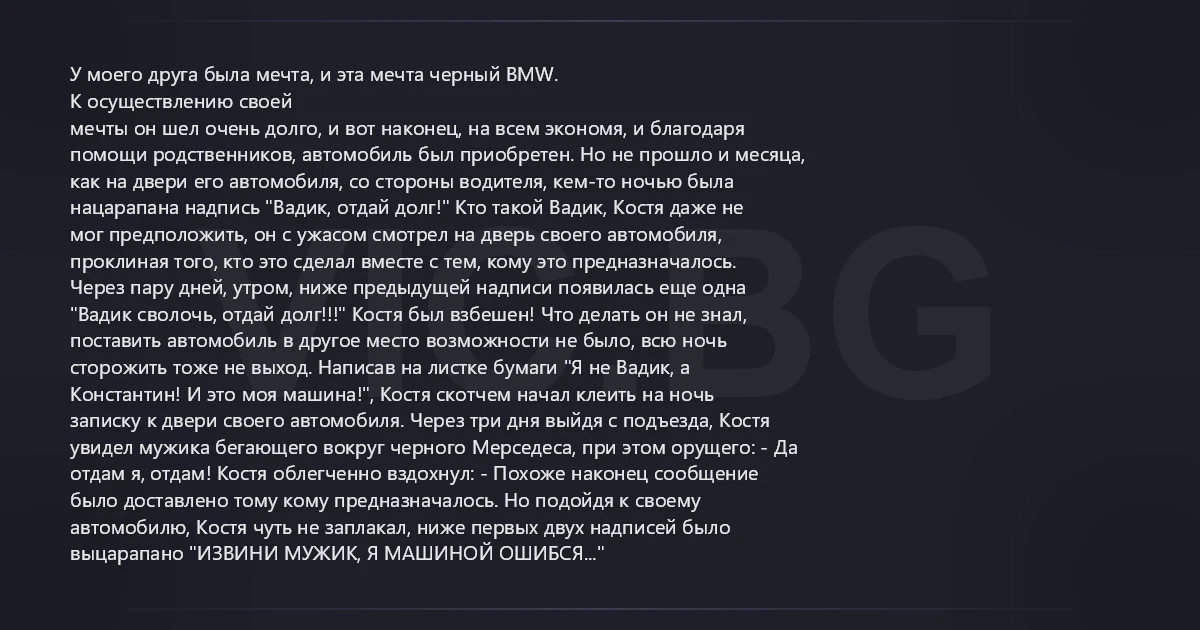 У моего друга была мечта, и эта мечта черный BMW. К осуществлению своей мечты он шел очень долго, и вот наконец, на всем экономя, и благодаря помощи родственников, автомобиль был приобретен. Но не прошло и месяца, как на двери его автомобиля, со стороны водителя, кем-то ночью была нацарапана надпись "Вадик, отдай долг!" Кто такой Вадик, Костя даже не мог предположить, он с ужасом смотрел на дверь своего автомобиля, проклиная того, кто это сделал вместе с тем, кому это предназначалось. Через пару дней, утром, ниже предыдущей надписи появилась еще одна "Вадик cboлoчь, отдай долг!!!" Костя был взбешен! Что делать он не знал, поставить автомобиль в другое место возможности не было, всю ночь сторожить тоже не выход. Написав на листке бумаги "Я не Вадик, а Константин! И это моя машина!", Костя скотчем начал клеить на ночь записку к двери своего автомобиля. Через три дня выйдя с подъезда, Костя увидел мужика бегающего вокруг черного Мерседеса, при этом орущего: - Да отдам я, отдам! Костя облегченно вздохнул: - Похоже наконец сообщение было доставлено тому кому предназначалось. Но подойдя к своему автомобилю, Костя чуть не заплакал, ниже первых двух надписей было выцарапано "ИЗВИНИ МУЖИК, Я МАШИНОЙ ОШИБСЯ..."