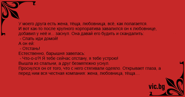 У моего друга есть жена, тёща, любовница, всё, как полагается. И вот как-то после крупного корпоратива завалился он к любовнице, добавил у неё и... заснул. Она давай его будить и скандалить: - Спать иди домой! А он ей: - Отстань! Естественно, барышня завелась: - Что-о-о?! Я тебе сейчас отстану, я тебе устрою! Вышла из спальни, а друг безмятежно уснул. Проснулся он от того, что с него стягивали одеяло. Открывает глаза, а перед ним вся честная компания: жена, любовница, тёща. Разозлил барышню. Она к нему домой и позвонила. Он на них всех посмотрел и говорит: - С тобой, жена, развожусь! Тебя, любовница, бросаю! А вы, мама, какого хуя здесь делаете? Это же вообще не ваша история... Живут после этого долго и счастливо: и жена и любовница, и даже тёща...