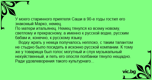 У моего старинного приятеля Саши в 90-е годы гостил его знакомый Марко, немец.