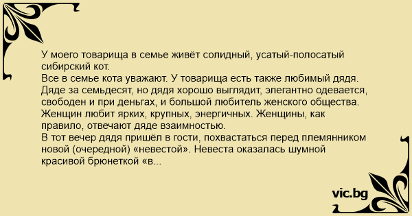 Все в семье кота уважают. У товарища есть также любимый дядя. Дяде за семьдесят, но дядя хорошо выглядит, элегантно одевается, свободен и при деньгах, и большой любитель женского общества. Женщин любит ярких, крупных, энергичных. Женщины, как правило, отвечают дяде взаимностью.