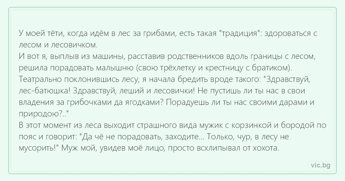 У моей тёти, когда идём в лес за грибами, есть такая "традиция": здороваться с лесом и лесовичком. И вот я, выплыв из машины, расставив родственников вдоль границы с лесом, решила порадовать малышню (свою трёхлетку и крестницу с братиком). Театрально поклонившись лесу, я начала бредить вроде такого: "Здравствуй, лес-батюшка! Здравствуй, леший и лесовички! Не пустишь ли ты нас в свои владения за грибочками да ягодками? Порадуешь ли ты нас своими дарами и природою?.." В этот момент из леса выходит страшного вида мужик с корзинкой и бородой по пояс и говорит: "Да чё не порадовать, заходите... Только, чур, в лесу не мусорить!" Муж мой, увидев моё лицо, просто всхлипывал от хохота.