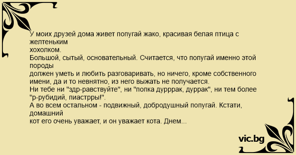 У моих друзей дома живет попугай жако, красивая белая птица с желтеньким хохолком.