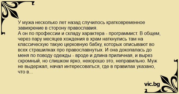 А он по профессии и складу характера - программист. В общем, через пару месяцев хождения в храм наткнулись там на классическую такую церковную бабку, которых описывают во всех страшилках про православнутых. И она докопалась до меня по поводу одежды - вроде и длина приличная, и вырез скромный, но слишком ярко, нехорошо это, неправильно. Муж не выдержал, начал интересоваться, где в правилах указано, что в церковь надо приходить исключительно в сереньком и что значит - "все же знают", если мы вот не знали. Бабушка зависла, потом начала на нас ворчать в духе "ходють тут всякие". Муж сказал, что либо она загоняется, либо у церкви ТЗ для посетителей составлено неправильно. И как-то охладел к религии с тех пор. В общем, когда говорят про кого-то, что "как бабка отшептала", я всегда представляю вполне конкретную бабку из той церкви.