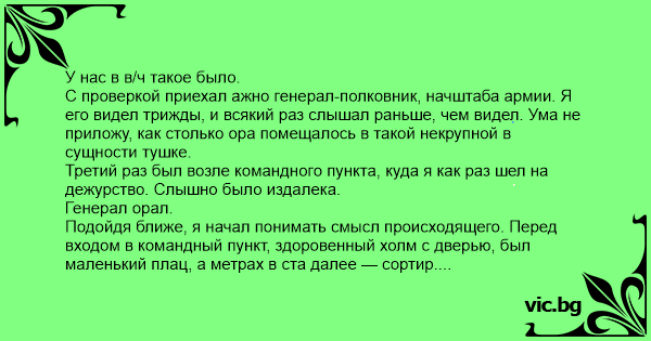 С проверкой приехал ажно генерал-полковник, начштаба армии. Я его видел трижды, и всякий раз слышал раньше, чем видел. Ума не приложу, как столько ора помещалось в такой некрупной в сущности тушке.