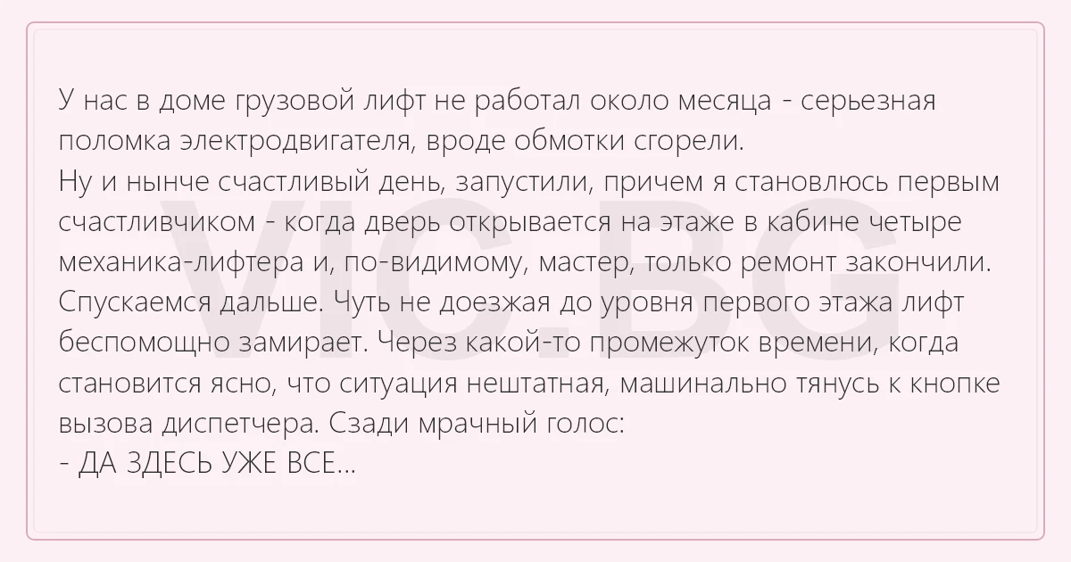 У нас в доме грузовой лифт не работал около месяца - серьезная поломка электродвигателя, вроде обмотки сгорели. Ну и нынче счастливый день, запустили, причем я становлюсь первым счастливчиком - когда дверь открывается на этаже в кабине четыре механика-лифтера и, по-видимому, мастер, только ремонт закончили. Спускаемся дальше. Чуть не доезжая до уровня первого этажа лифт беспомощно замирает. Через какой-то промежуток времени, когда становится ясно, что ситуация нештатная, машинально тянусь к кнопке вызова диспетчера. Сзади мрачный голос: - ДА ЗДЕСЬ УЖЕ ВСЕ...