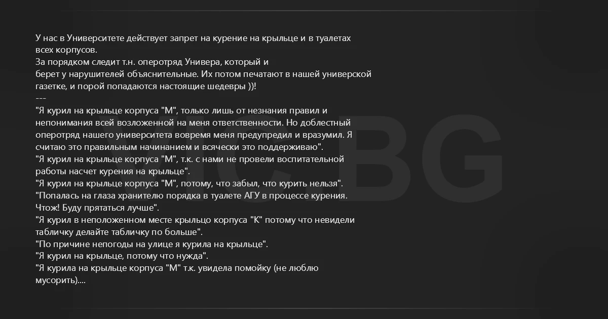 "Я курил на крыльце корпуса "М", потому, что забыл, что курить нельзя".