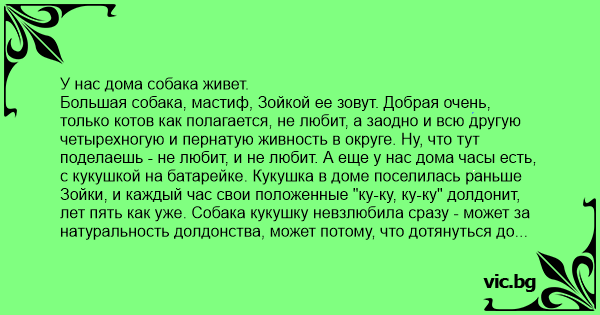 Большая собака, мастиф, Зойкой ее зовут. Добрая очень, только котов как полагается, не любит, а заодно и всю другую четырехногую и пернатую живность в округе. Ну, что тут поделаешь - не любит, и не любит. А еще у нас дома часы есть, с кукушкой на батарейке. Кукушка в доме поселилась раньше Зойки, и каждый час свои положенные "ку-ку, ку-ку" долдонит, лет пять как уже. Собака кукушку невзлюбила сразу - может за натуральность долдонства, может потому, что дотянуться до нее не может. Только для Зойки это не повод отступаться. Говорю ж, мастиф - благородных кровей леди, сдохнет скорее, чем от своего откажется. И вот уже год, каждый час когда кукушка вылезает из своего дупла, собака садится напротив и начинает гавкать. Вы слышали, как лает стокилограммовая мастифиха? Нет? Я вам завидую. Потому что мастифиха может лаять даже и негромко, но мимо ушей ее мнение пропустить сложно, нереально практически. Впрочем, мы в конце концов научились не обрашать внимания, иначе б давно с ума сошли. Дас сами представьте, каждый час одно и то же: "Ку-ку, ку-ку!.. ГРРАФ-ГРРАФ! Ку-ку, ку-ку, ГРРАФФ-ГРРАФФФ!" И так до конца боя. Ага, и в двенадцать ночи тоже, ровно двенадцать раз. Честное слово, мы пытались собаку отучить, чего только не делали - бесполезно. Жена в сердцах хотела кукушку демонтировать, но тут уж я в позу встал - еще не хватало у собственной собаки на поводу идти, да будь она хоть трижды аристократических кровей! Так и привыкли не обращать внимания.