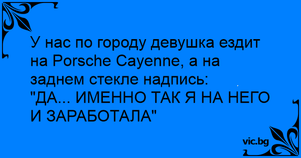 В нашия град руса девойка кара Porsche Cayenne, а на задното и стъкло има надпис: