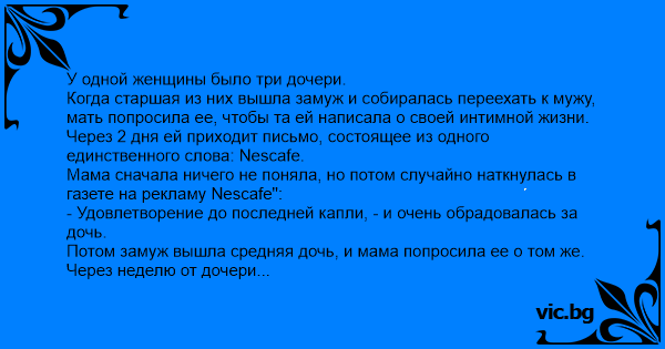 Когда старшая из них вышла замуж и собиралась переехать к мужу, мать попросила ее, чтобы та ей написала о своей интимной жизни. Через 2 дня ей приходит письмо, состоящее из одного единственного слова: Nescafe.