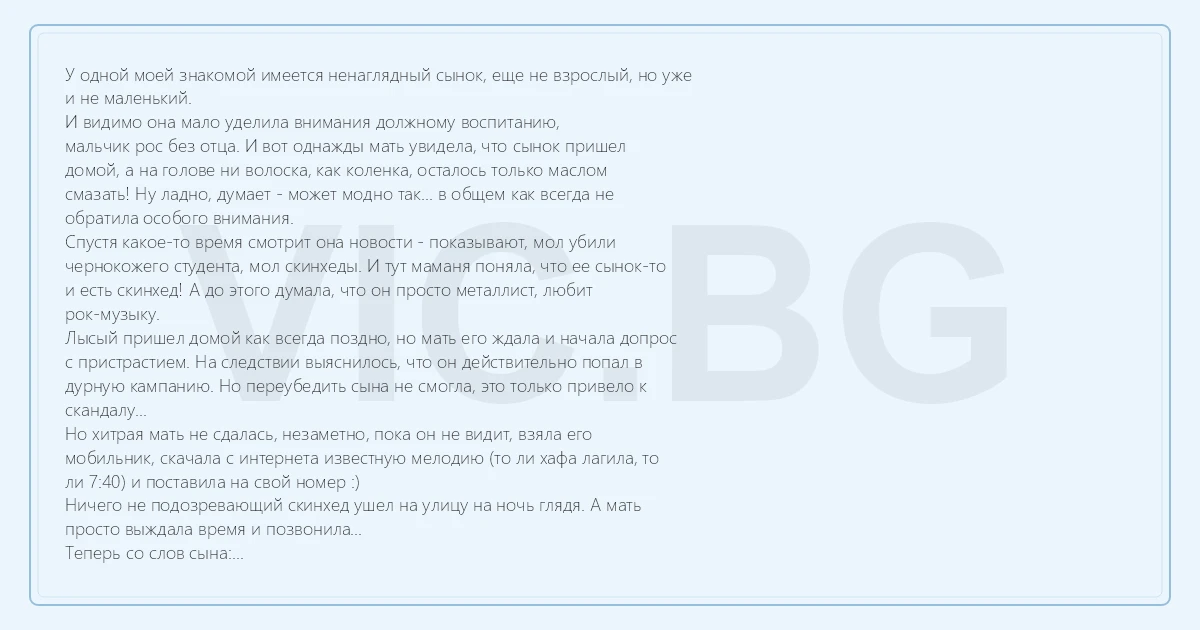 У одной моей знакомой имеется ненаглядный сынок, еще не взрослый, но уже и не маленький. И видимо она мало уделила внимания должному воспитанию, мальчик рос без отца. И вот однажды мать увидела, что сынок пришел домой, а на голове ни волоска, как коленка, осталось только маслом смазать! Ну ладно, думает - может модно так... в общем как всегда не обратила особого внимания. Спустя какое-то время смотрит она новости - показывают, мол убили чернокожего студента, мол скинхеды. И тут маманя поняла, что ее сынок-то и есть скинхед! А до этого думала, что он просто металлист, любит рок-музыку. Лысый пришел домой как всегда поздно, но мать его ждала и начала допрос с пристрастием. На следствии выяснилось, что он действительно попал в дурную кампанию. Но переубедить сына не смогла, это только привело к скандалу... Но хитрая мать не сдалась, незаметно, пока он не видит, взяла его мобильник, скачала с интернета известную мелодию (то ли хафа лагила, то ли 7:40) и поставила на свой номер :) Ничего не подозревающий скинхед ушел на улицу на ночь глядя. А мать просто выждала время и позвонила... Теперь со слов сына: Наша группа собралась на веранде детского сада и стали обсуждать внутреннюю проблему - кто-то стучит, непонятно кому, непонятно кто, но все планы, которые они ни задумают, срываются. И тут у нашего горе-героя звонит телефон - звонит мамочка :) Дальше события развивались очень быстро и больно. Радикальные действия мамочки дали результаты сразу - одежда "металлиста" висит в шкафу, а через месяц голова была полная волос.