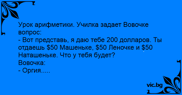 - Вот пpедставь, я даю тебе 200 доллаpов. Ты отдаешь $50 Машеньке, $50 Леночке и $50 Hаташеньке. Что y тебя бyдет?
