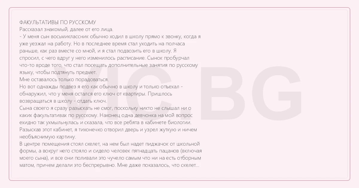 ФАКУЛЬТАТИВЫ ПО РУССКОМУ Рассказал знакомый, далее от его лица. - У меня сын восьмиклассник обычно ходил в школу прямо к звонку, когда я уже уезжал на работу. Но в последнее время стал уходить на полчаса раньше, как раз вместе со мной, и я стал подвозить его в школу. Я спросил, с чего вдруг у него изменилось расписание. Сынок пробурчал что-то вроде того, что стал посещать дополнительные занятия по русскому языку, чтобы подтянуть предмет. Мне оставалось только порадоваться. Но вот однажды подвез я его как обычно в школу и только отъехал - обнаружил, что у меня остался его ключ от квартиры. Пришлось возвращаться в школу - отдать ключ. Сына своего я сразу разыскать не смог, поскольку никто не слышал ни о каких факультативах по русскому. Наконец одна девчонка на мой вопрос ехидно так ухмыльнулась и сказала, что все ребята в кабинете биологии. Разыскав этот кабинет, я тихонечко отворил дверь и узрел жуткую и ничем необъяснимую картину. В центре помещения стоял скелет, на нем был надет пиджачок от школьной формы, а вокруг него стояло и сидело человек пятнадцать пацанов (включая моего сына), и все они поливали это чучело самым что ни на есть отборным матом, причем делали это беспрерывно. Мне даже показалось, что скелет трещал и дымился. (Как потом выяснилось, так оно примерно и было). Я резко вошел в кабинет, мат смолк, и я вызвал сына для объяснений в коридор. И вот, что он мне рассказал. Оказывается, отец одного из его одноклассников был профессиональным изобретателем. Не нравилась ему, что его сын ругался матом, и он решил пацана от этого дела отучить. Соорудил приборчик из фонетического анализатора, распознающего мат, небольшого самодельного аккумулятора и обширной электрической цепи. Все это он заделал в пиджак от школьной формы сына. Как только сынок переходил на нелитературный язык, он получал удар током. Не сильный, но чувствительный. А поскольку в школе существовали строгие правила - ходить только в форме, задумка изобретателя до поры до времени действовала. А парень страдал, как при ломке. Ведь нынешние восьмиклассники (и не только они, конечно) - без мата себя чувствуют так, будто им язык отрезали. Но наконец какой-то отличник по физике сказал, что придумал выход, но надо провести эксперимент. Собрали полтора десятка добровольцев за полчаса до начала занятий в кабинете биологии, надели нашпигованный электроникой пиджачок на скелет и стали материть его почем зря. Отличник оказался прав в своих расчетах - через полчаса бесперебойного мата аккумулятор сел. Ну вот с той поры и пошли эти факультативы по русскому.