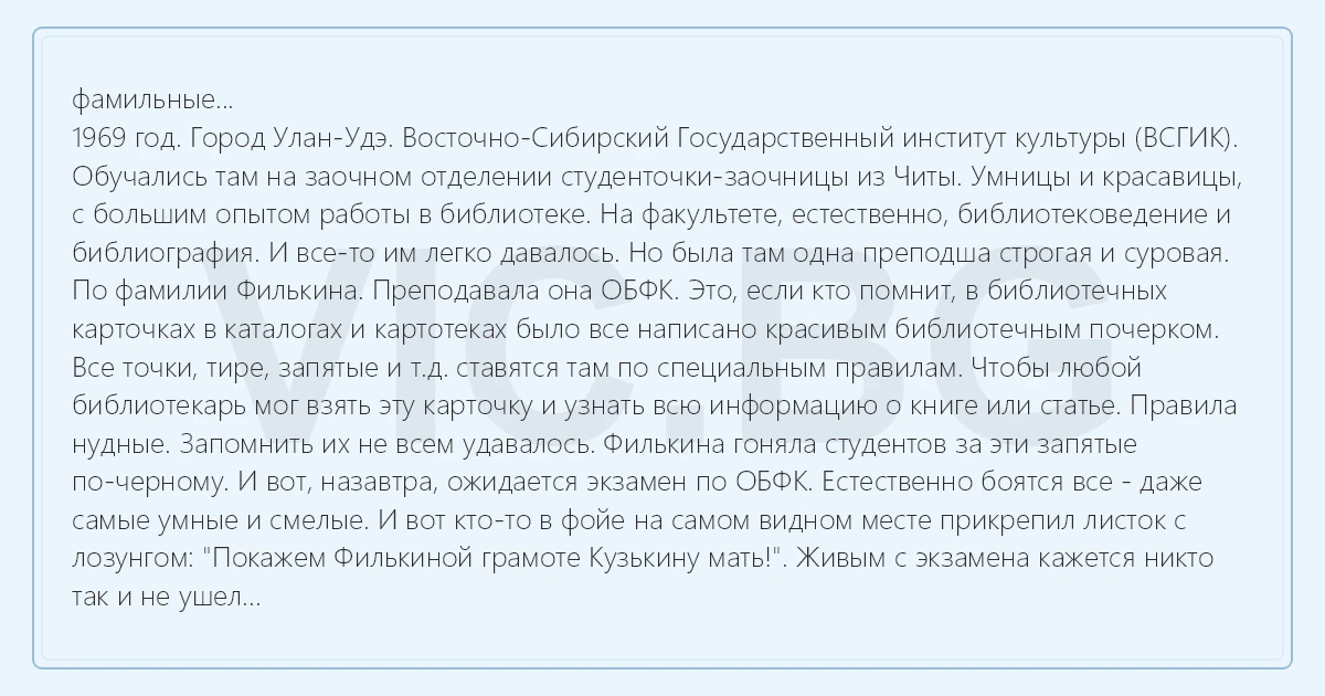 фамильные... 1969 год. Город Улан-Удэ. Восточно-Сибирский Государственный институт культуры (ВСГИК). Обучались там на заочном отделении студенточки-заочницы из Читы. Умницы и красавицы, с большим опытом работы в библиотеке. На факультете, естественно, библиотековедение и библиография. И все-то им легко давалось. Но была там одна преподша строгая и суровая. По фамилии Филькина. Преподавала она ОБФК. Это, если кто помнит, в библиотечных карточках в каталогах и картотеках было все написано красивым библиотечным почерком. Все точки, тире, запятые и т.д. ставятся там по специальным правилам. Чтобы любой библиотекарь мог взять эту карточку и узнать всю информацию о книге или статье. Правила нудные. Запомнить их не всем удавалось. Филькина гоняла студентов за эти запятые по-черному. И вот, назавтра, ожидается экзамен по ОБФК. Естественно боятся все - даже самые умные и смелые. И вот кто-то в фойе на самом видном месте прикрепил листок с лозунгом: "Покажем Филькиной грамоте Кузькину мать!". Живым с экзамена кажется никто так и не ушел...